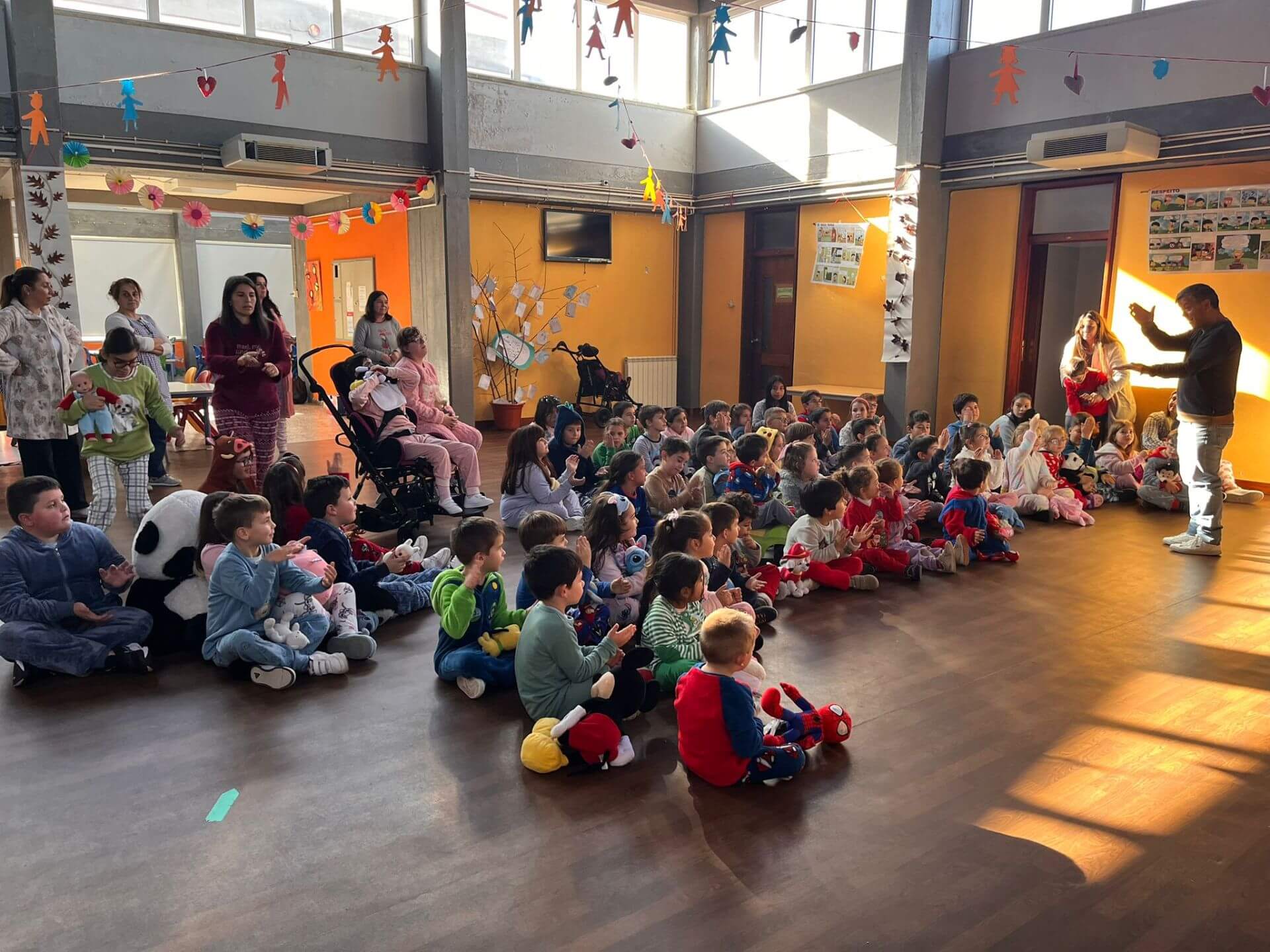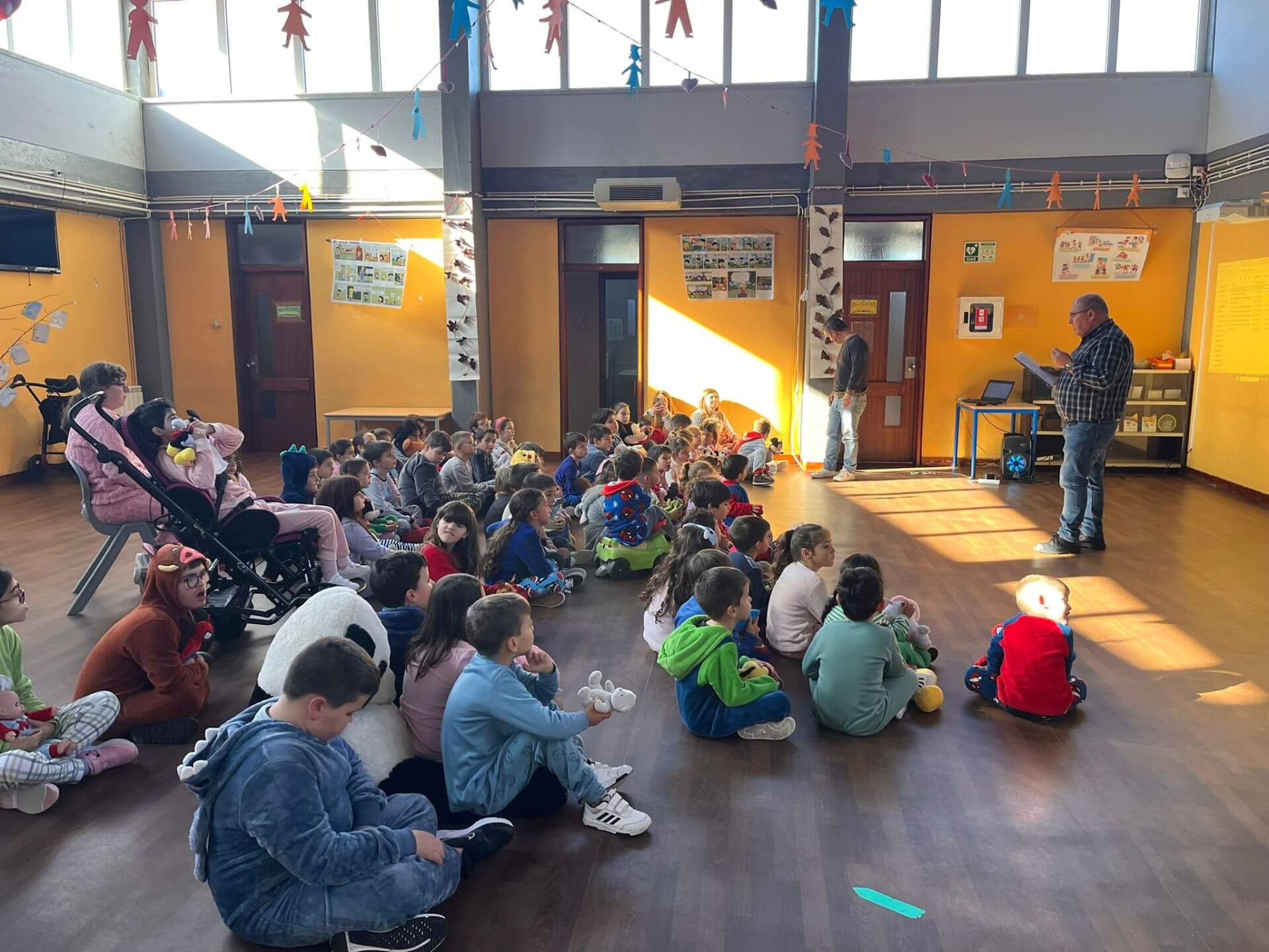 Logo pela manhã, a escola encheu-se de cor e alegria com a chegada dos alunos vestidos de pijama, trazendo consigo uma energia especial que marcou todo o dia. As crianças participaram em diversas atividades lúdicas e educativas, como contos, canções, jogos cooperativos e trabalhos de expressão plástica, sempre orientados para os valores da solidariedade e do cuidado com o próximo.